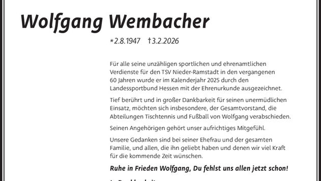 Wolfgang Wembacher ist bereits am 01.01.1961, als mit 14 Jahren in den TSV Nieder-Ramstadt e.V. eingetreten und direkt Tischtennis gespielt, keine andere Sportart wurde ausgeübt. In der Abteilung hat er sich hochgearbeitet bis in die erste Mannschaft, in welcher er rund 30 Jahre aktiver Spieler war. In seiner Altersklasse gehörte er immer zu den besten Spielern im Kreis und im Bezirk. Ein Angebot, als bezahlter Profispieler in der zweiten Tischtennis-Bundesliga zu spielen, le